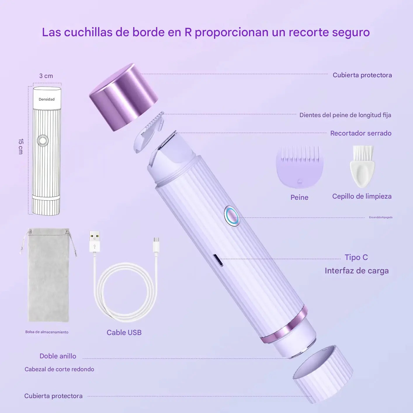 Materiales: Cuchillas de acero inoxidable hipoalergénico + cuerpo de ABS ergonómico